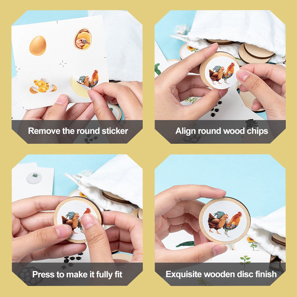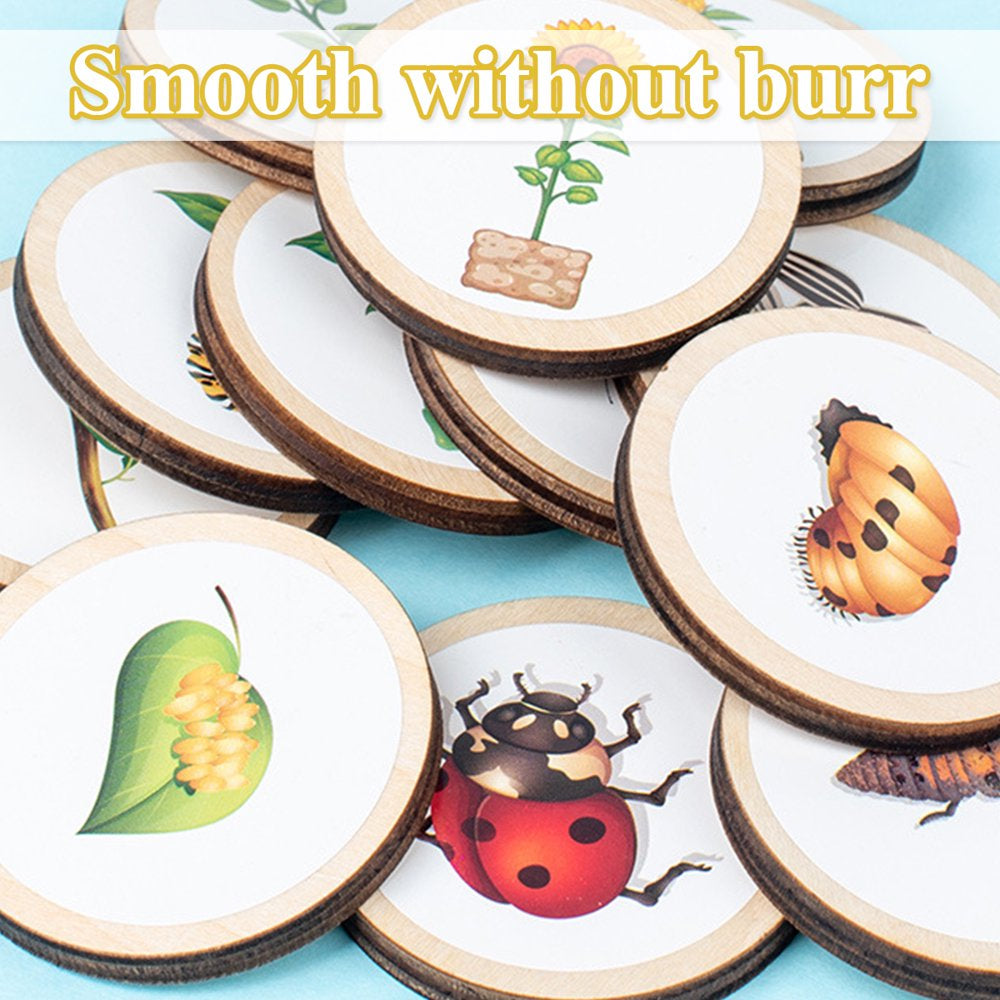 [Wooden Life Cycle Puzzle] Made of thick, durable wood with bright colors and illustrations of animals, plants and insects. Rounded and detailed, smooth and burr-free.