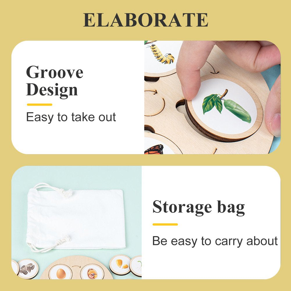 - [Wooden Life Cycle Puzzle] Made of thick, durable wood with bright colors and illustrations of animals, plants and insects. Rounded and detailed, smooth and burr-free.