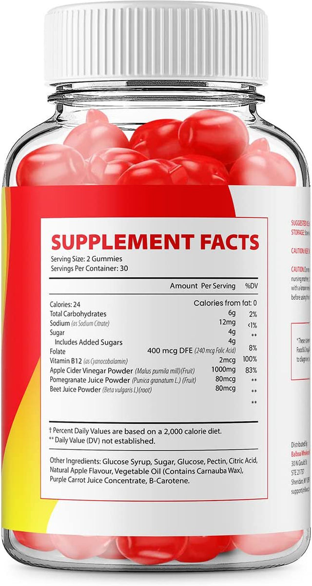 Ingredients:Apple Cider Vinegar, Beet Juice, Beet Root, Pectin, Citric Acid, Folic Acid, Pomegranate, Vitamin B12, Sodium Citrate, Glucose, Sugar, Glucose Syrup, Natural Apple Flavor, Vegetable Oil, Carrot Concentrate, Beta Carotene, Carnuba Wax