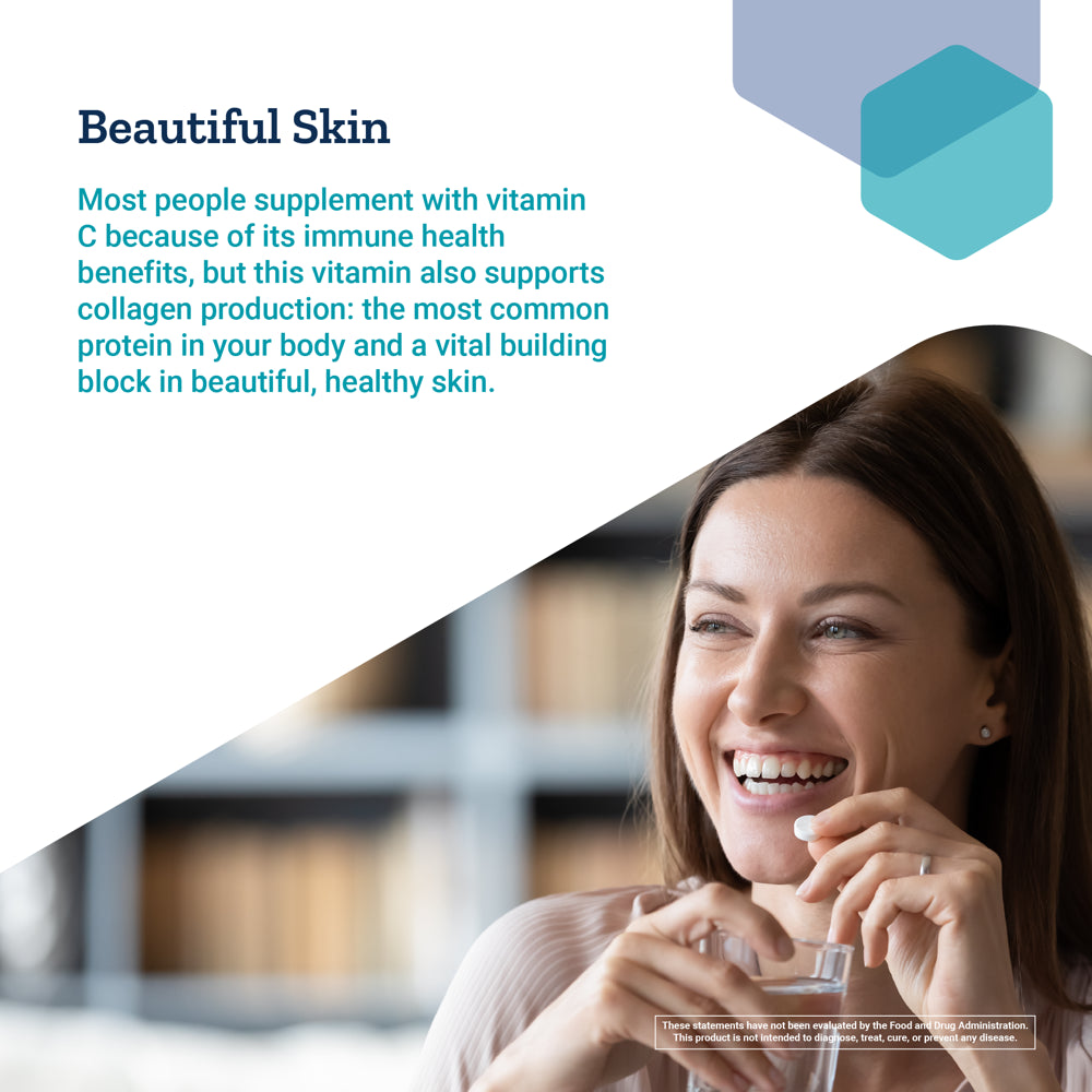 - BEAUTIFUL SKIN - Most people supplement with vitamin C because of its immune health benefits, but this vitamin also supports collagen production: the most common protein in your body and a vital building block in beautiful, healthy skin.