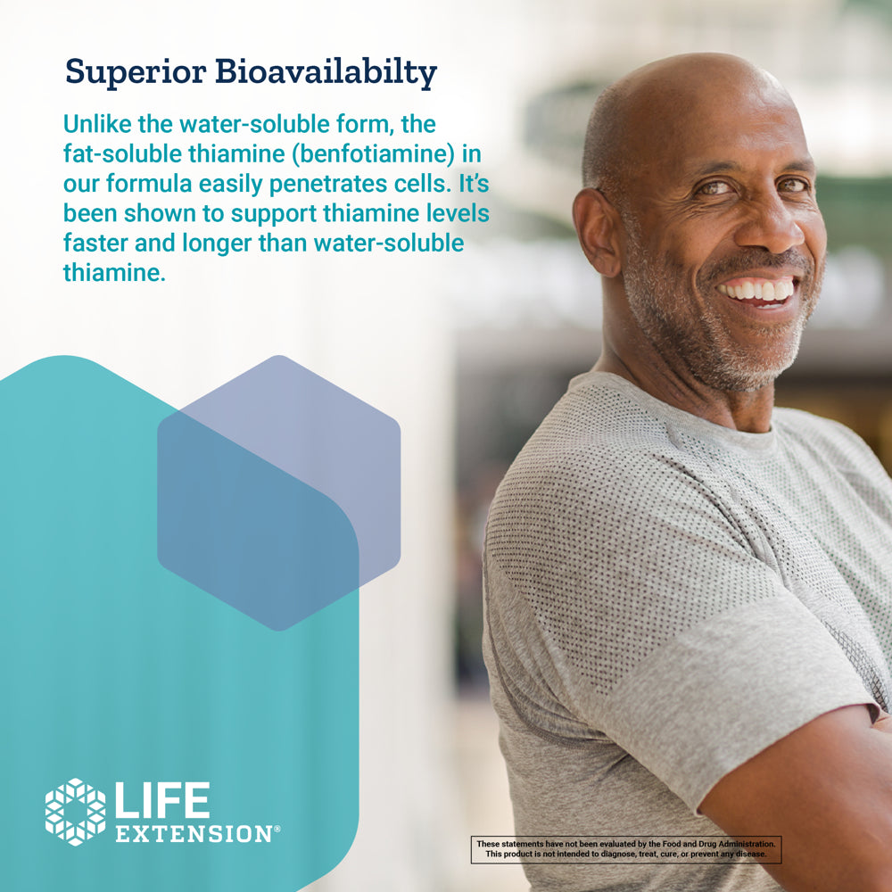 - SUPERIOR BIOAVAILABILITY - Unlike the water-soluble form, the fat-soluble thiamine (benfotiamine) in our formula easily penetrates cells. It’s been shown to support thiamine levels faster and longer than water-soluble thiamine.