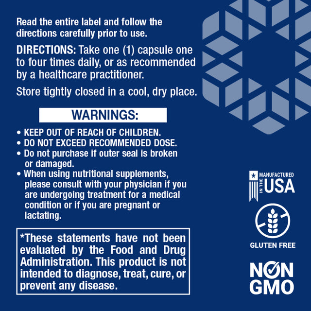 | Recommended Use | Take one (1) capsule one to four times daily with or without food, or as recommended by a healthcare professional. Store tightly closed in a cool, dry place. |