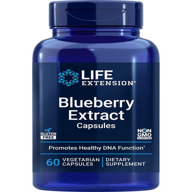 Life Extension Blueberry Extract Capsules - 60 Vegetarian Capsules Life Extension Blueberry Extract Capsules contain a combination of highly concentrated wild blueberry extracts (not cultivated). Life Extension Blueberry Extract Capsules extracts are standardized to natural compounds that have the highest health benefits associated with consumption of fresh blueberries. The two most active constituents found in Life Extension Blueberry Extract Capsules are anthocyanins and pterostilbene. Blueberry anthocyanins are considered one of nature’s most potent antioxidants. Pterostilbene is the other blueberry constituent that helps maintain healthy lipid and glucose levels that are already within healthy ranges. Through its unique biological effects and antioxidative potential, pterostilbene helps maintain healthy DNA structure.