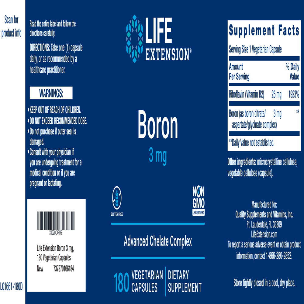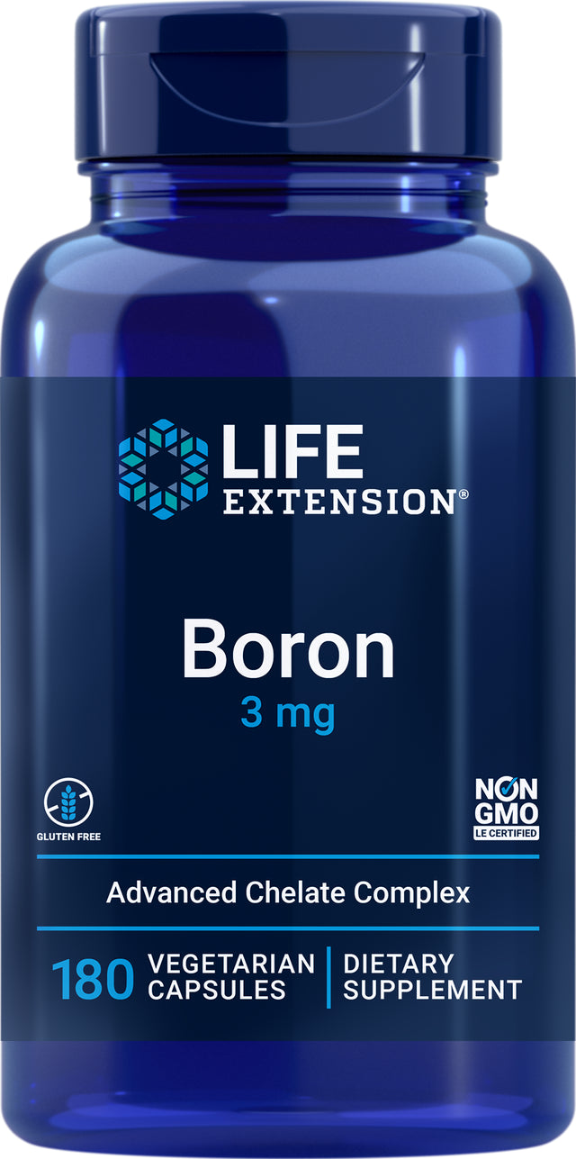 - ENHANCED with Vitamin B Riboflavin. This Tri-Boron supplement from LifeExtension contains 3mg of Boron for women and men. 180 Capsules per bottle.