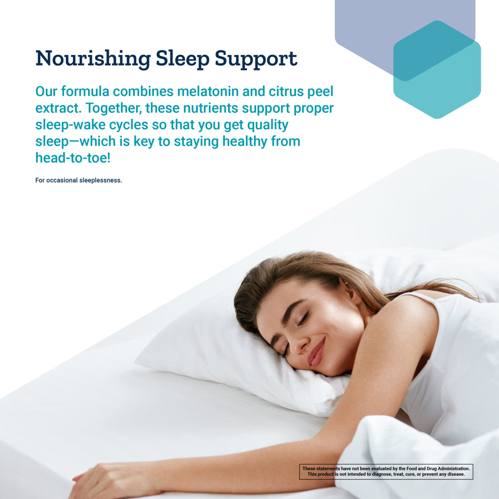 - NOURISHING SLEEP SUPPORT - Our formula combines melatonin and citrus peel extract. Together, these nutrients support proper sleep-wake cycles so that you get quality sleep which is key to staying healthy from head-to-toe!