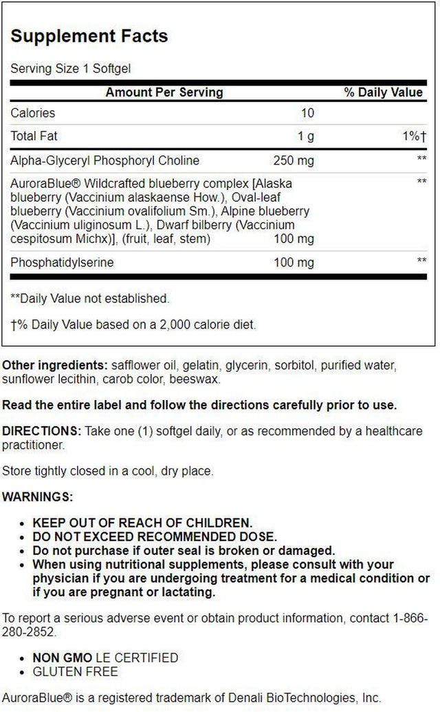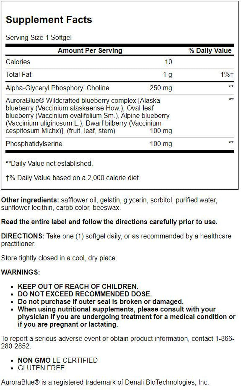 Keep your brain functioning at its best with Cognitex Alpha GPC, our foundational brain health formula. Alpha-glyceryl phosphoryl choline helps support the production of the neurotransmitter acetylcholine, a neurotransmitter that is directly involved in maintaining healthy cognitive function. Phosphatidylserine (PS) promotes brain cell-to-brain cell communication. Finally, wild blueberry extract helps inhibit oxidative stress and encourages a healthy brain, which is especially important as we age. These three ingredients combined help keep your brain and overall cognitive function healthy for the long haul. This formula is non-GMO and gluten-free.