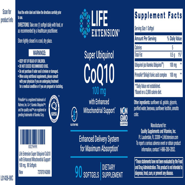 Life Extension Super Ubiquinol Co Q10 100mg with Mitochondrial Support is a highly absorbable form of ubiquinol CoQ10.