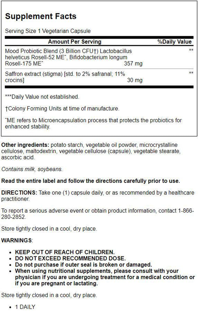 - GUT FEELINGS SHOULD BE GOOD FEELINGS - Believe it or not, digestive health is tied to your mood. This blend of probiotics and clinically studied saffron extract supports a balanced mood and brain health.