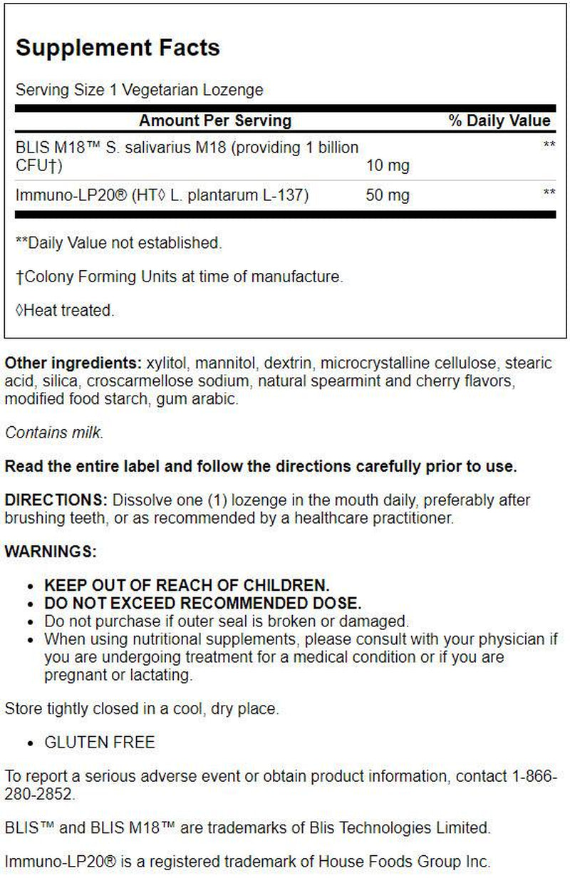 This innovative oral probiotic provides healthy bacteria in the form of patented probiotic strain S. salivarius M18 alongside heat-treated Lactobacillus plantarum L-137. These clinically studied ingredients help inhibit the growth of unwanted bacteria in the mouth, optimize oral pH, support healthy gums, and even promote immune health and a healthy inflammatory response. All these functions play a role in fostering a healthy mouth environment and overall oral health. This gluten-free, vegetarian oral health probiotic comes in lozenge form so you can access the benefits immediately. Support your best mouth hygiene with FLORASSIST Oral Hygiene today!