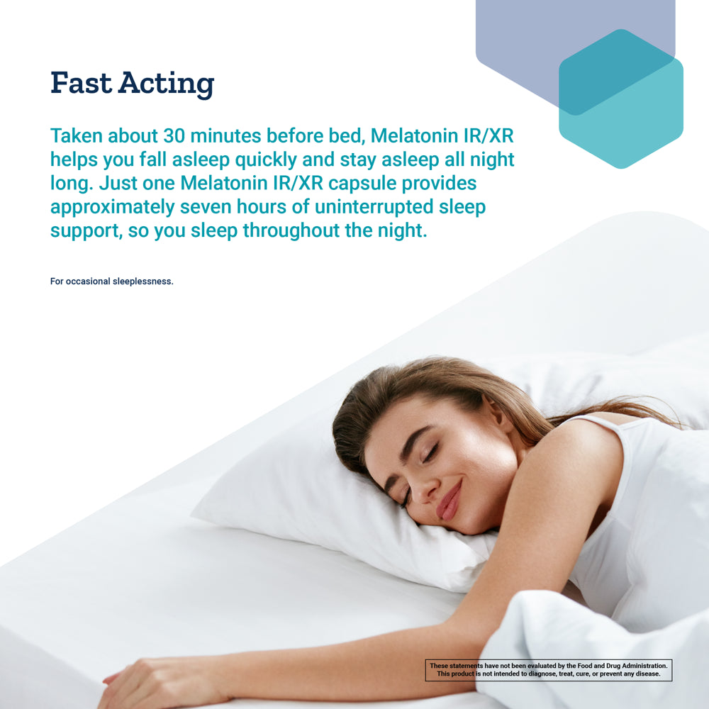 - FAST ACTING - Taken about 30 minutes before bed, Melatonin IR/XR helps you fall asleep quickly and stay asleep all night long. Just one Melatonin IR/XR capsule provides approximately seven hours of uninterrupted sleep support, so you sleep throughout the night.