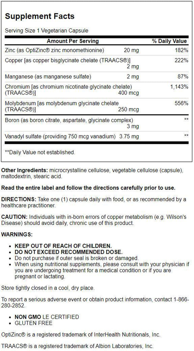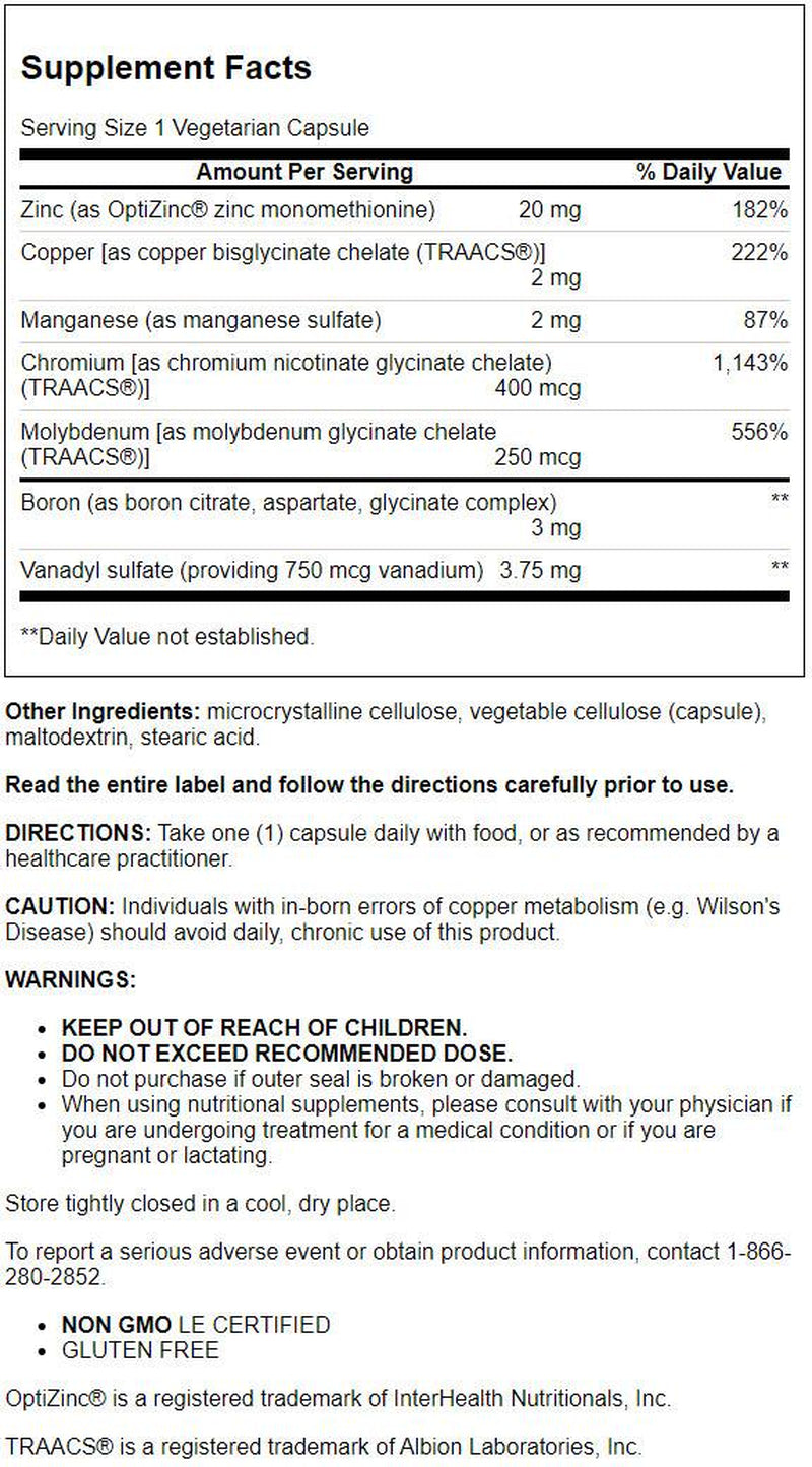 - WHAT ARE TRACE MINERALS? - Zinc, chromium, boron, vanadyl sulfate and copper are some of the trace minerals we all need for optimal health. Trace minerals play an important role in hundreds of our bodily functions - from supporting our immune system to helping maintain healthy bones and joints. Our formula provides bioavailable forms to support your healthy body and immune function, all in one convenient supplement.