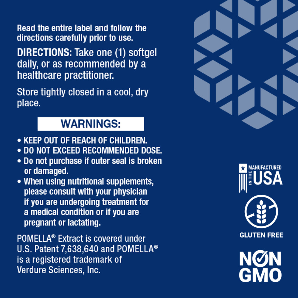 - WHY WE USE THE ENTIRE POMEGRANATE PLANT - Our Pomegranate Complete formula features standardized pomegranate fruit extracts sourced from pomegranate’s fruit, flower, and seed oil. Why? By using the entire pomegranate plant, our formula offers a broad range of health benefits. It includes the equivalent polyphenol content of about 12 oz of juice.