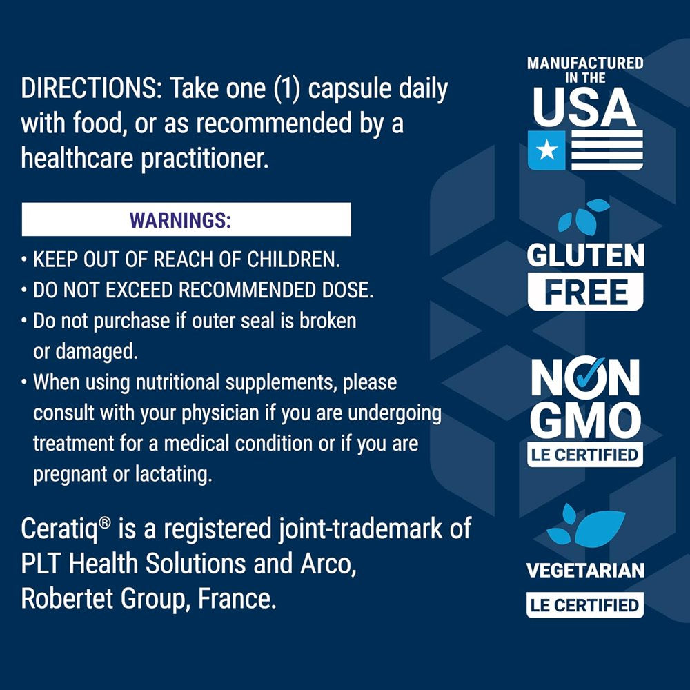 Ceratiq® wheat (Triticum vulgare) oil extract (providing glycolipids, phytoceramides and glycosylceramides) 350 mg Other ingredients: rice bran oil, vegetable cellulose (capsule), silica, rosemary extract. Contains wheat Non-GMO Gluten-free Ceratiq® is a registered joint-trademark of PLT Health Solutions and Arco, Robertet Group, France./div>