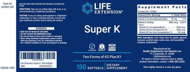 Life Extension Super K 150 Softgels combines vitamin K1 with two forms of vitamin K2 in a once-daily vitamin K supplement to help support bone & heart health.