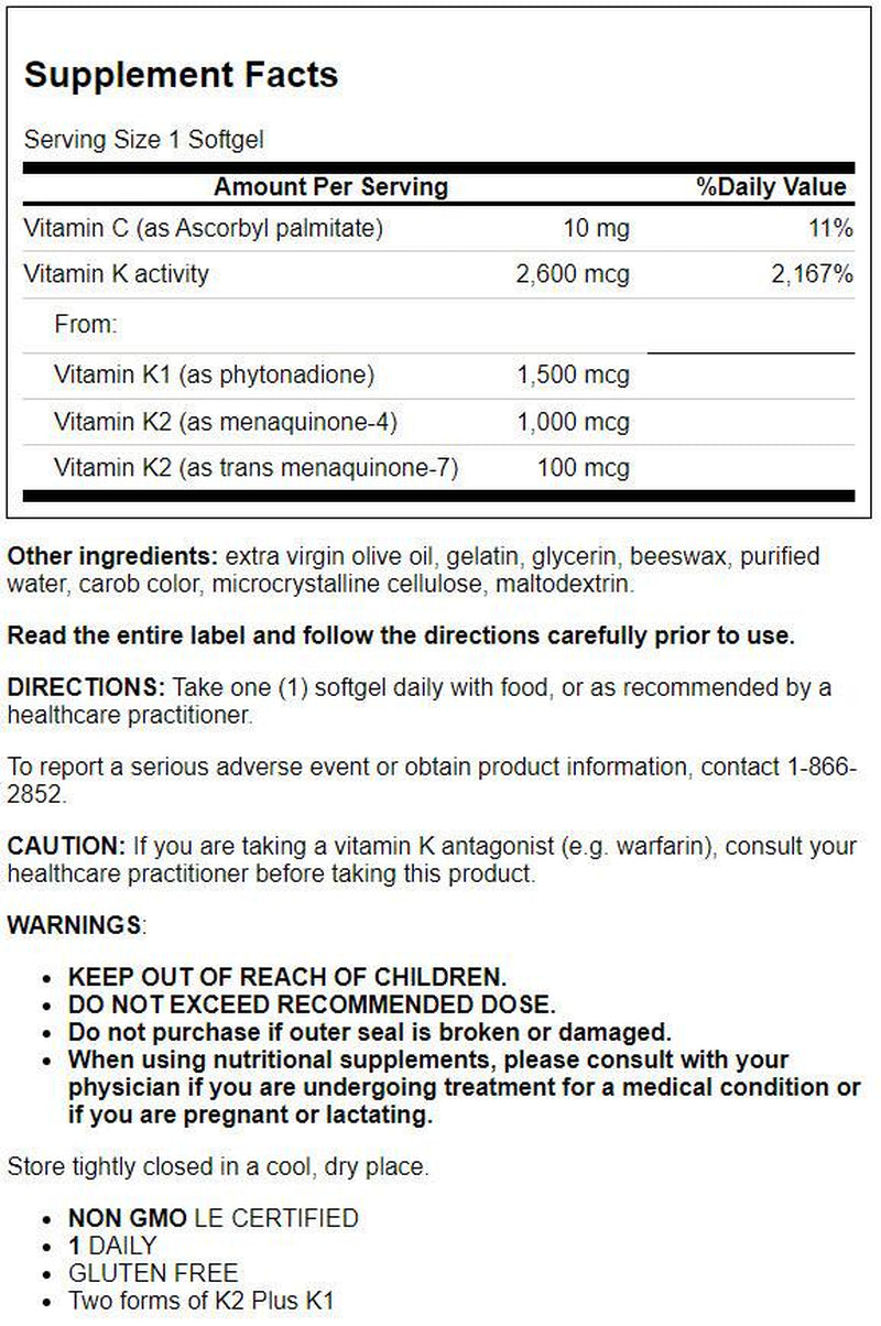- Strong bones, healthy heart—Vitamin K helps maintain your body’s calcium balance, which affects everything from arterial health to bone density health. But it’s hard to get sufficient vitamin K from food. This formula provides a potent dose of 2600 mcg of vitamin K from both K1 and two forms of K2.