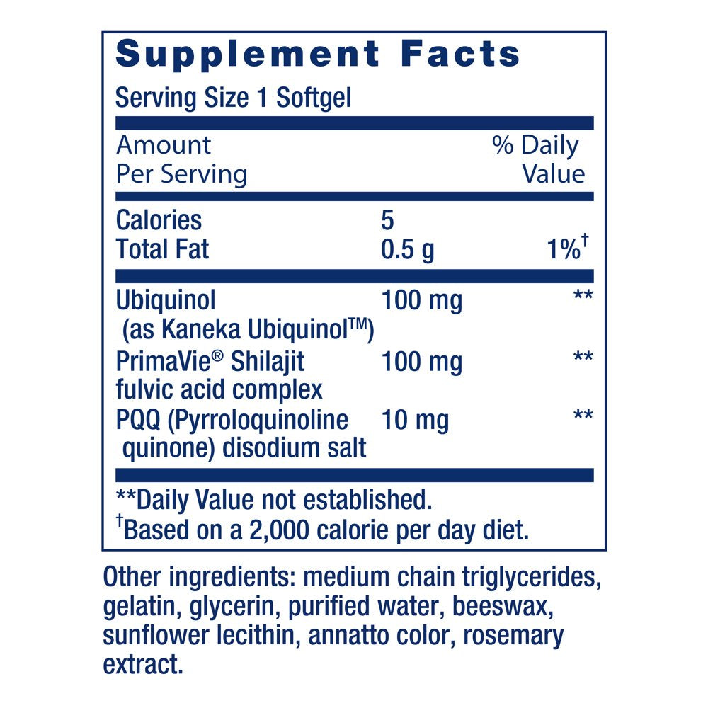 Workhorse organs like your heart never rest, which is why heart muscle cells need a lot of coenzyme Q10, or CoQ10. Unfortunately, naturally occurring levels of CoQ10 decline over time, but supplementing can help. Traditional CoQ10 is difficult for the body to absorb. So, we use a highly bioavailable form of CoQ10 called ubiquinol to better support the cardiovascular system and youthful energy production. We combined this ubiquinol CoQ10 with shilajit to promote cellular energy production and augment CoQ10’s effectiveness. We also added PQQ, a potent antioxidant that has been shown to support the formation of new mitochondria (the tiny powerpacks in your cells that produce energy).