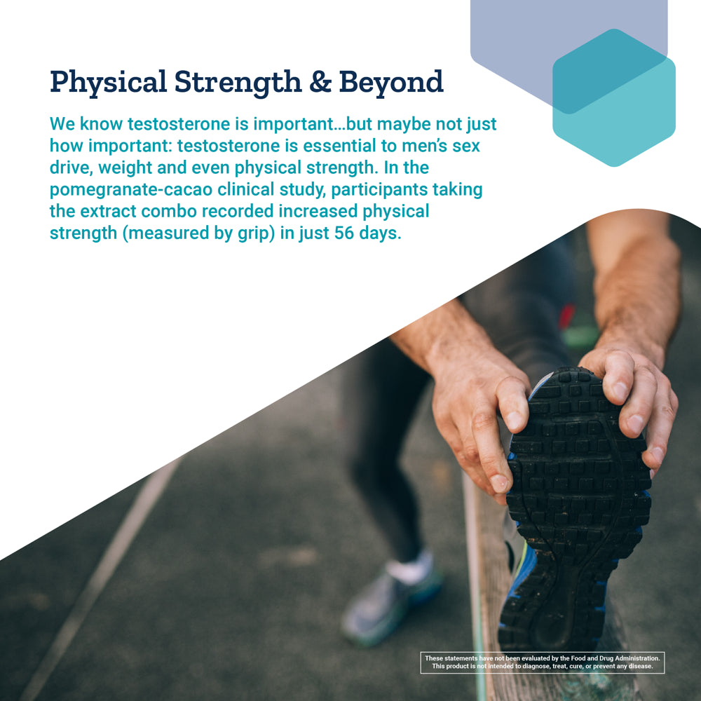 - PHYSICAL STRENGTH & BEYOND - We know testosterone is important…but maybe not just how important: testosterone is essential to men’s sex drive, weight and even physical strength. In the pomegranate-cacao clinical study, participants taking the extract combo recorded increased physical strength (measured by grip) in just 56 days.