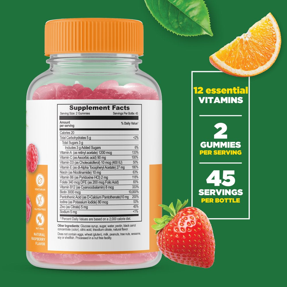 Our gummies are formulated with vitamin a (acetate), vitamin c (ascorbic acid), vitamin d3 (cholecalciferol), vitamin e, b6 (pyridoxine), b9 (folate - folic acid), b12 (cobalamin), b7 (biotin), b5 (pantothenic acid), iodine, zinc, and b3 (niacin), to give you all the vitamins you need in just one gummy.