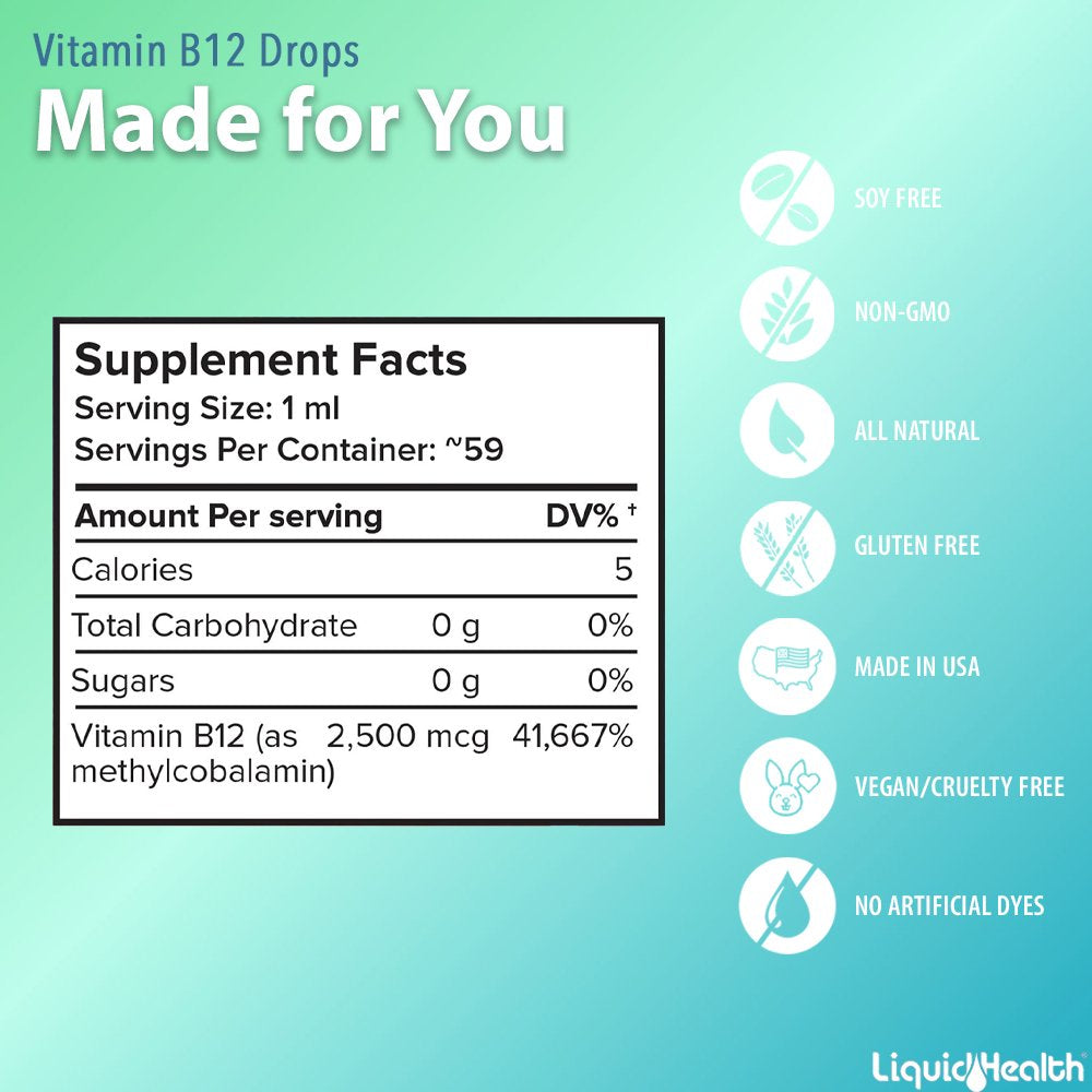 - 100% VEGAN, NON GMO, NO SUGAR, GLUTEN, DAIRY and SOY: Our Liquid Health B12 Methtlycobalamin is made with no sugar, starch, salt, yeast, gluten, dairy, soy, additives, or fillers. No artificial ingredients were used to manufacture this B12 supplement.