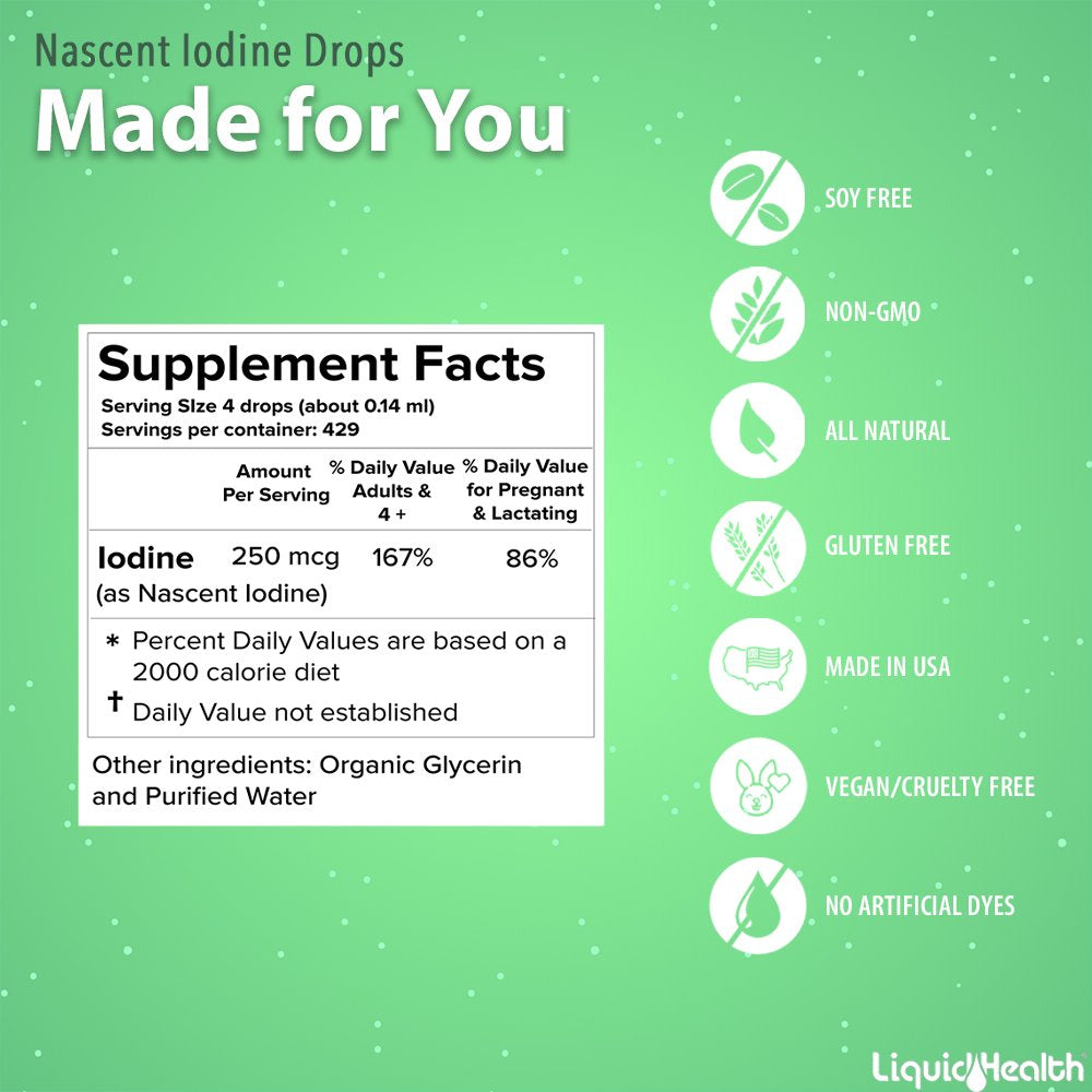 - MADE IN THE USA WITH LOVE FOR 30+ YEARS - At Liquid Health, we craft and create all of our own products right here in America. After more than 30 years, we’ve become a leader in Liquid Vitamins & Supplements for you and your pets. It’s our greatest mission to provide the best quality and bioavailable liquid nutrients to our customers. From our many years of research and testing different formulations, we can honestly say nothing beats liquid when it comes to nascent iodine drops.