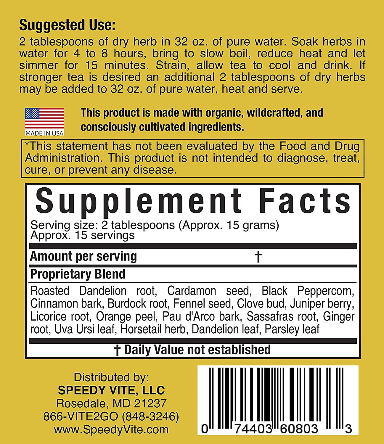 - ✓ Made with organic, wildcrafted and consciously cultivated ingredients: Dandelion root (roasted), Cardamom pod, Black Peppercorn, Cinnamon bark, Burdock root, Fennel seed, Clove bud, Juniper berry, Licorice root, Orange peel, Pau d' Arco bark, Sassafras root bark, Ginger root, Uva Ursi leaf, Horsetail herb, Dandelion leaf, Parsley leaf; 5.5 OZ (Approx 10. Servings)