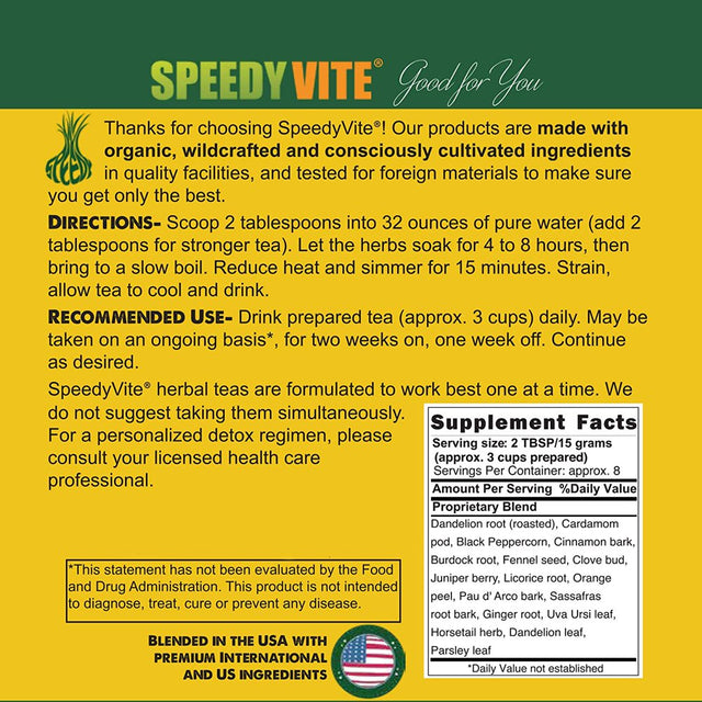 | Product Name | Liver Detox Tea Organic SpeedyVite Cleanses, Supports Liver, Gallbladder Health with Dandelion Root, Dandelion Leaf, Fennel, PAU d' Arco bark, Sassafras, Ginger |