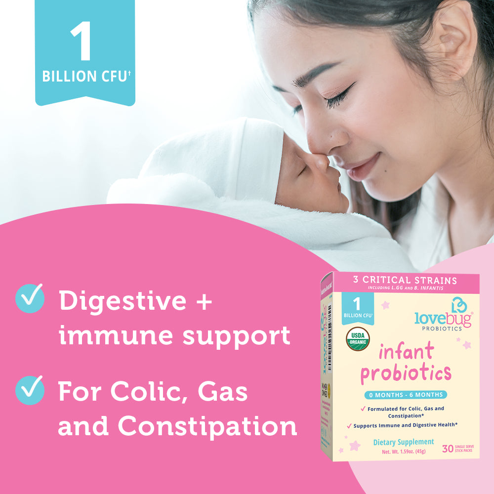 Lovebug Award Winning USDA Organic Probiotic for Infants, Ages 0 - 6 Months, Helps with Colic, Reflux, Diarrhea, Constipation & Gas, Tasteless Powder, Sugar Free, Allergen-Free, Non-GMO & Vegan. LoveBug's Organic Infant Probiotic Powder is specifically designed to promote good digestive health for your baby aged 0-6 months. This pack includes 30 flavorless, Organic, sugar free, and gluten free probiotic packets. Our packets have 1 Billion active cultures and 3 different strains, including Lactobacillus GG and Bifidum infantis to help support immune and digestive health. Shop the entire LoveBug assortment of probiotic supplements on Walmart!