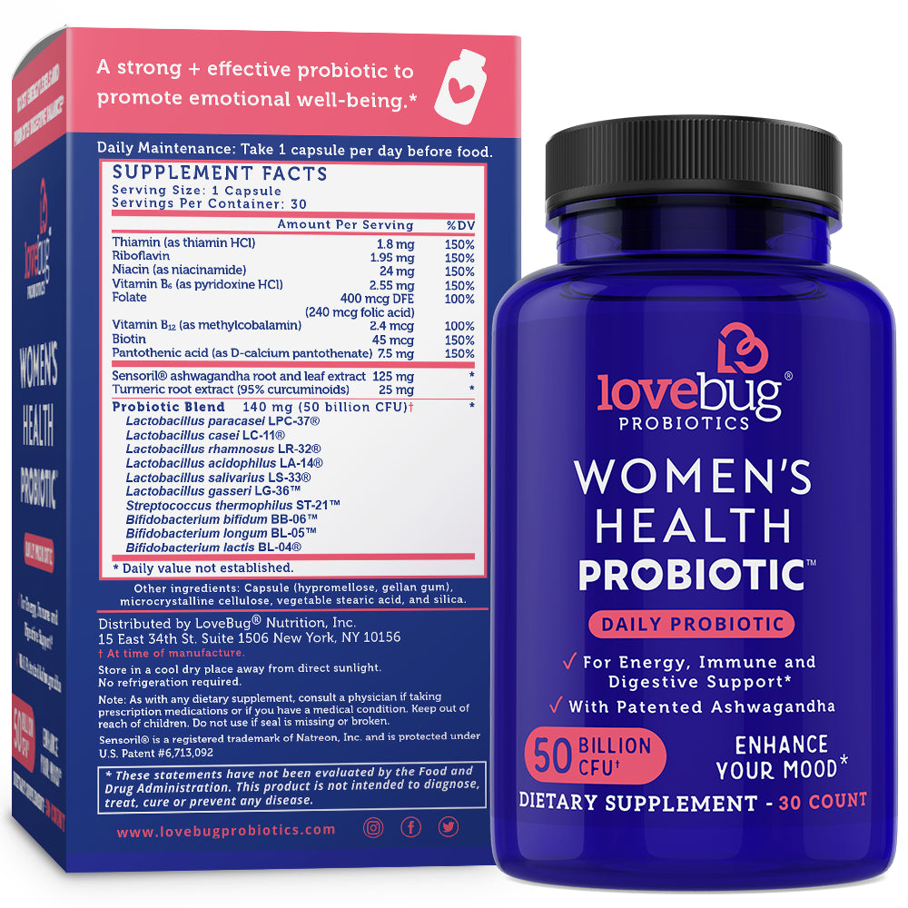 Boost Energy Levels and Promotes Digestive Balance For Energy with the LoveBug Probiotics Women's Health Prenatal Daily Probiotic. Immune and Digestive Support With Patented Ashwagandha 50 Billion CFU enhance your mood. A dietary supplement and a strong, effective probiotic to promote emotional well-being. Non-GMO and free of the 8 major allergens with no artificial colors or flavors. Shop the entire Lovebug assortment of probiotic supplements on Walmart!