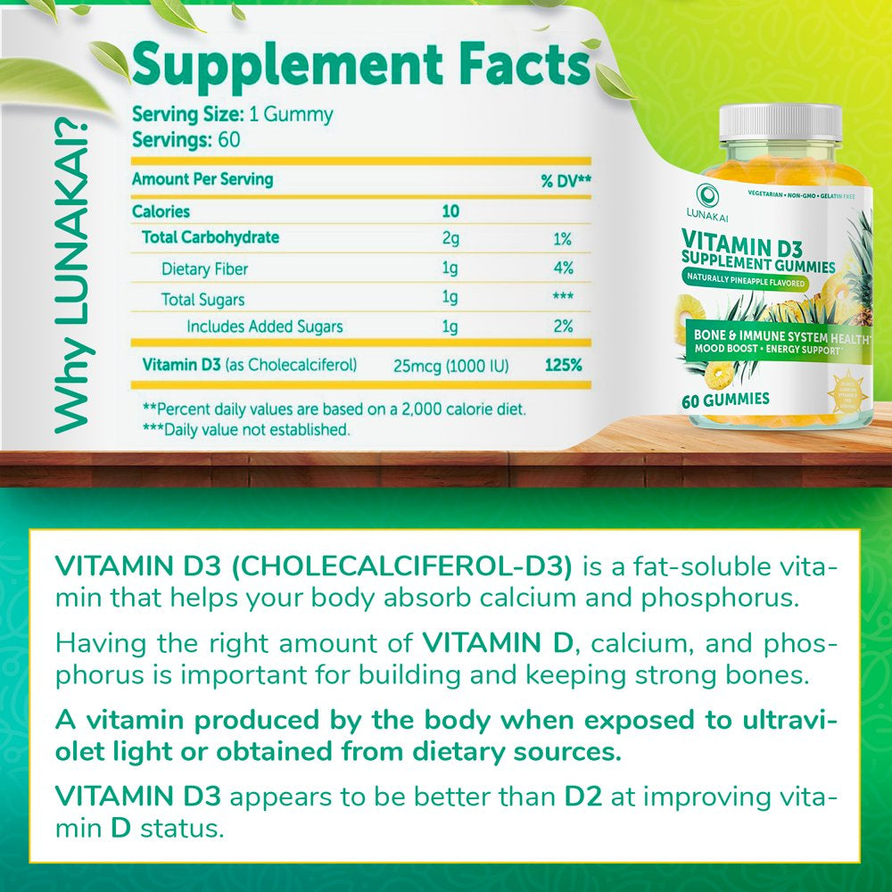 - Premium & Powerful Energy, Bone & Immunity Support - Lunakai vitamin D3 gummies are a premium made vitamin using No corn syrup or any other harmful sweeteners unlike many other D3 supplements. On our vitamin D gummies formulation we only used natural or organic ingredients
