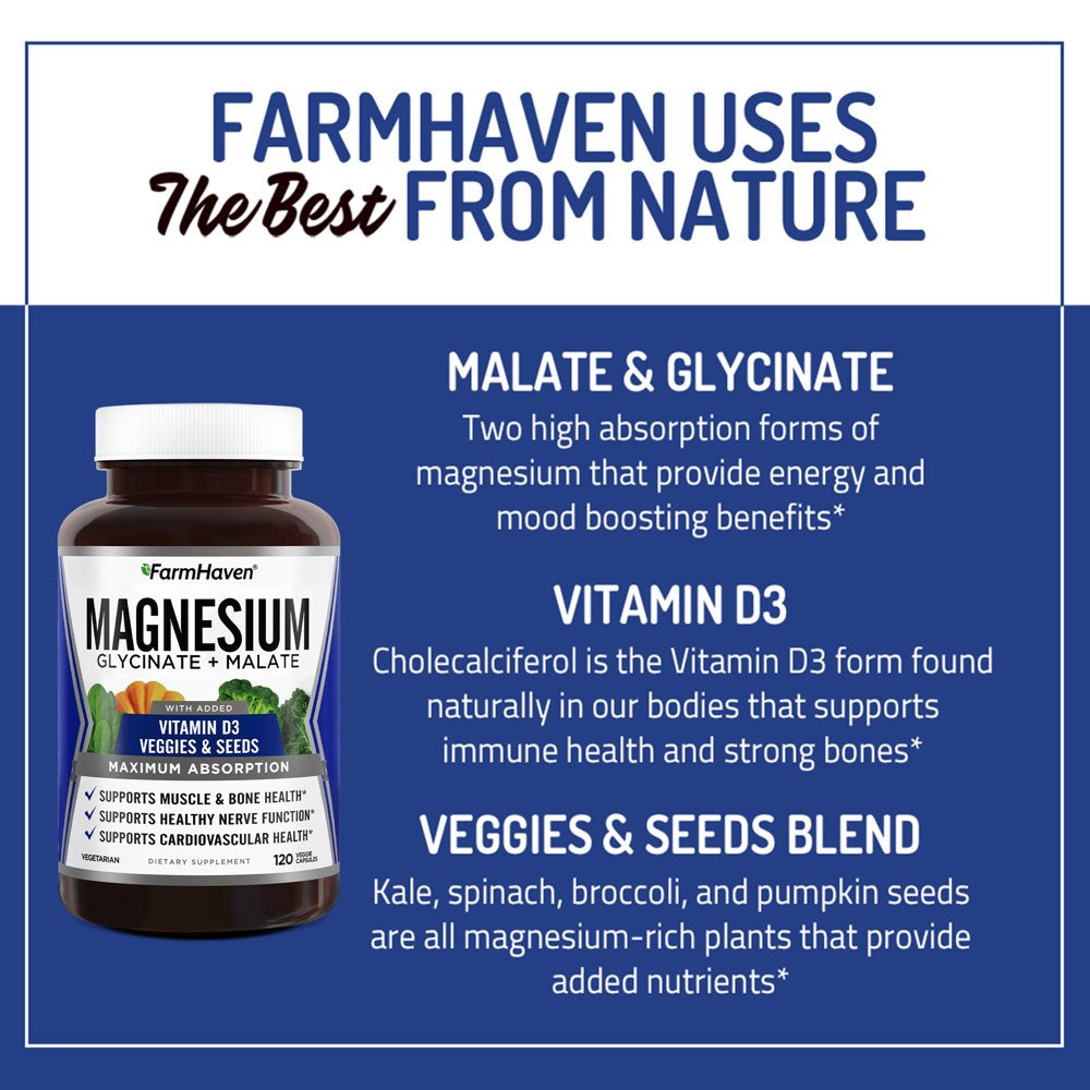 MAX ABSORPTION MAGNESIUM & VITAMIN D3: Our magnesium pills combine 250mg of magnesium Glycinate & Malate, 800 IU of Vitamin D3, and magnesium-rich veggies like spinach in easy-to-swallow capsules. Magnesium works perfectly with Vitamin D3 to support healt