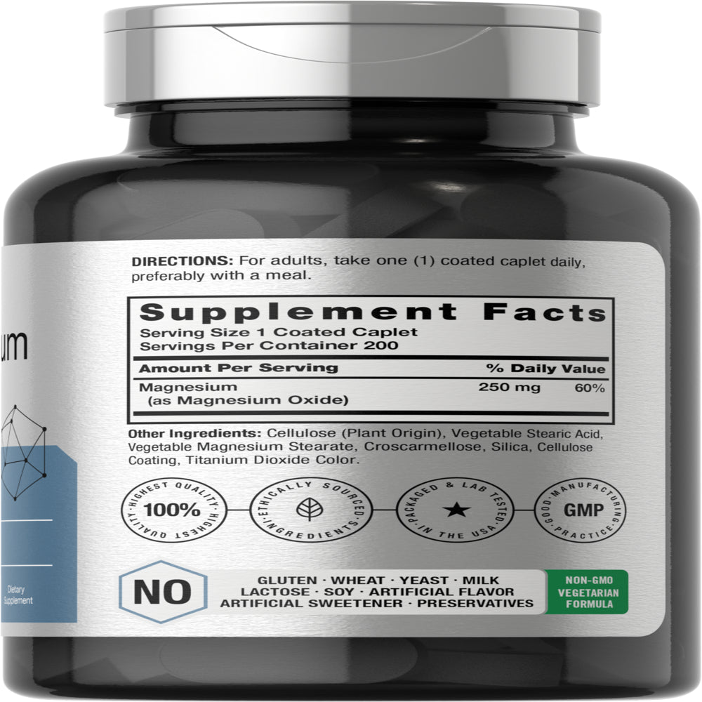 - VEGETARIAN FORMULA: Delivers 250 mg of Magnesium (as Magnesium Oxide) in each coated caplet