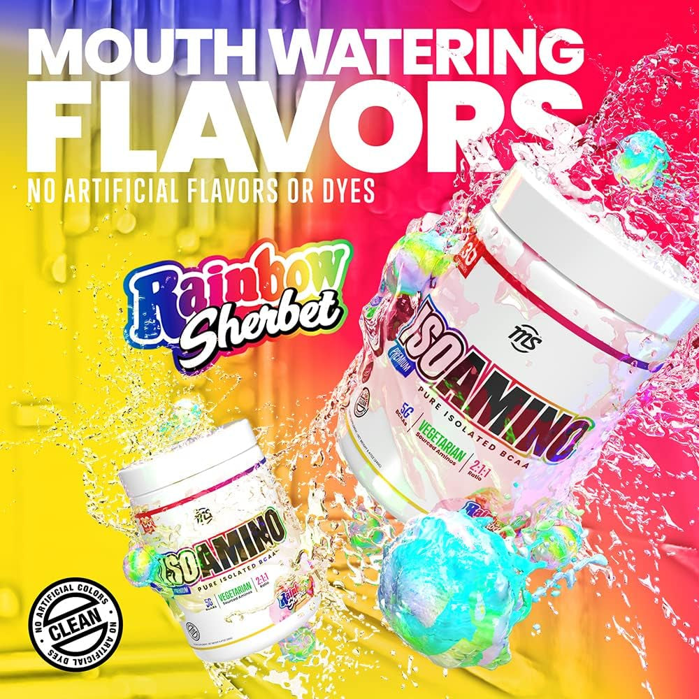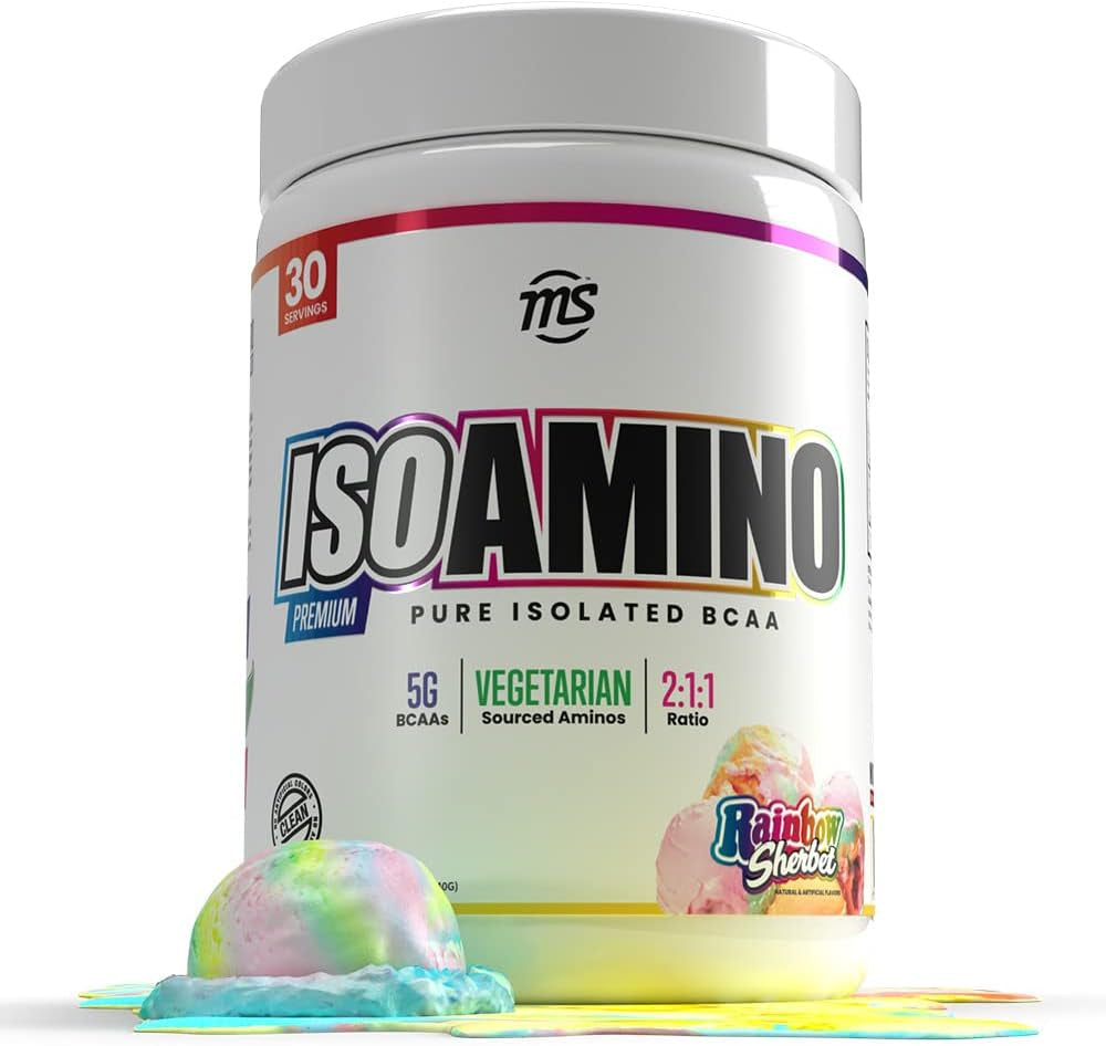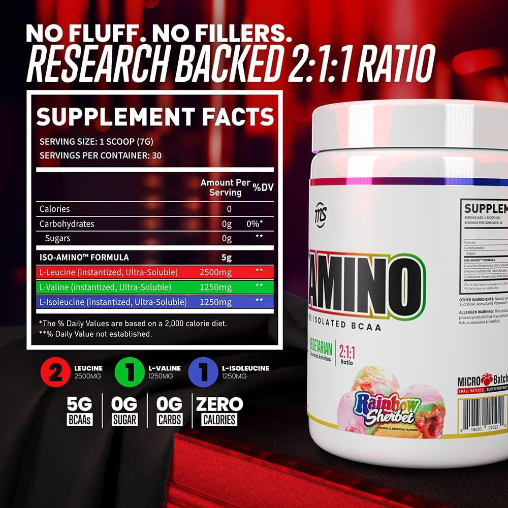 ISO-AMINO - Vegetarian Sourced Pure Isolated BCAA. Research validated 2:1:1 BCAA ratio. Burn fat & preserve lean muscle tissue. Accelerate exercise endurance & recovery. Mixes easily, taste incredible. Is-Amino packs 5 grams of vegetarian sourced pure isolated BCAAs per serving in a scientifically proven 2:1:1 ratio. No fluff, no fillers and no added colors or dyes. BCAAs are everything you need to rebuild, repair and trigger lean muscle growth. Is-Amino can be taken throughout the day and is especially useful intra-workout to speed recovery. We take flavor & mix ability very seriously, this is where Is-Amino stands as the clear leader. ISO-AMINO was the first ever CANDY FLAVORED supplement way back in 2014! The ultra-unique flavors and easy to mix powder set the standard for high quality BCAAs. Fuel your athletic performance with Is-Amino.