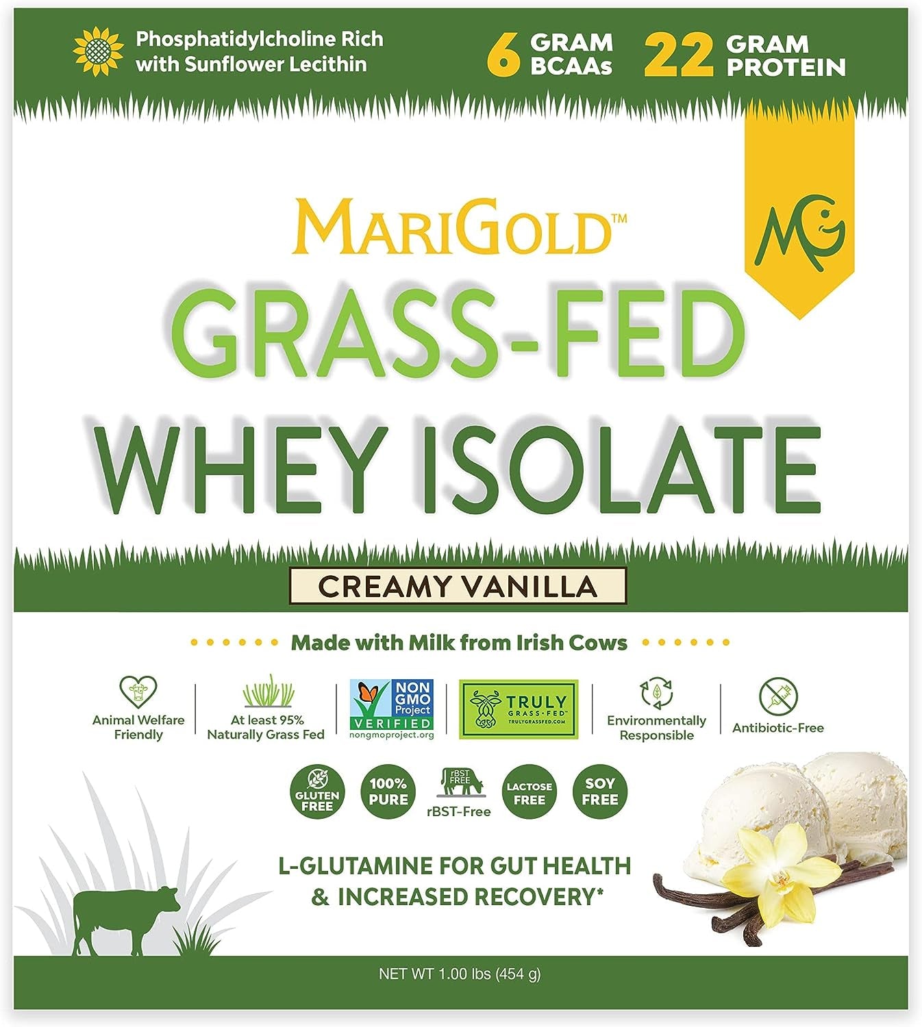 Marigold Grass-Fed Whey Protein Isolate Powder - Creamy Vanilla Flavor - 1 Lb Bag | 100% Pure, Cold-Processed, Micro-Filtered, Undenatured, Non-Gmo, Rbgh Free, Soy Free, Gluten Free, Lactose Free