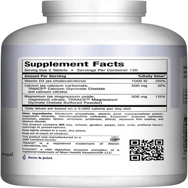 Nutrition Facts: Vitamin D3 (as cholecalciferol) 1000 IU 250%'Calcium (as calcium carbonate, TRAACS Calcium Glycinate Chelate as calcium citrate) 500 mg 50%'Magnesium (as magnesium oxide, TRAACS Magnesium Lysyl Glycinate Chelate, and magnesium citrate) 500 mg 125%