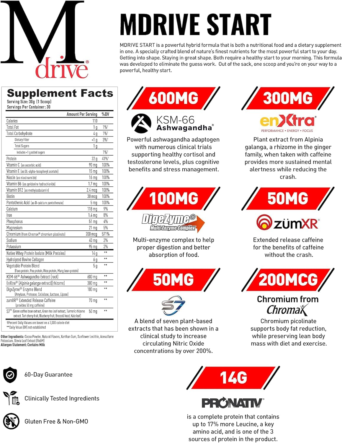 - 7 Clinically Tested Ingredients in Mdrive Start: 600mg KSM-66 Ashwagandha, 300mg Enxtra, 100mg Digezyme, 50mg caffeine from zumXR, 50mg S7, 200mcg chromium from Chromax, and 14g Pronativ