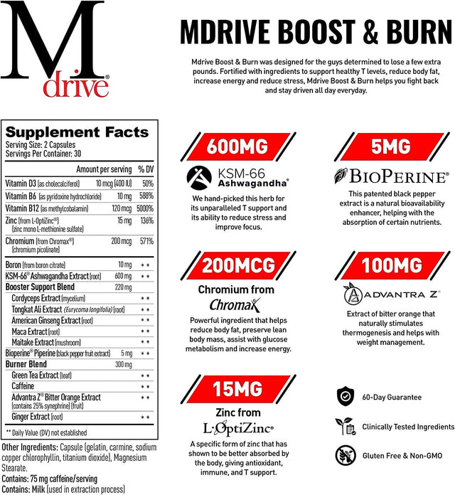 - Mdrive Boost & Burn 60 capsules and Mdrive Lean protein powder is a 30 day supply of powerful testosterone booster and weight loss bundle for driven men