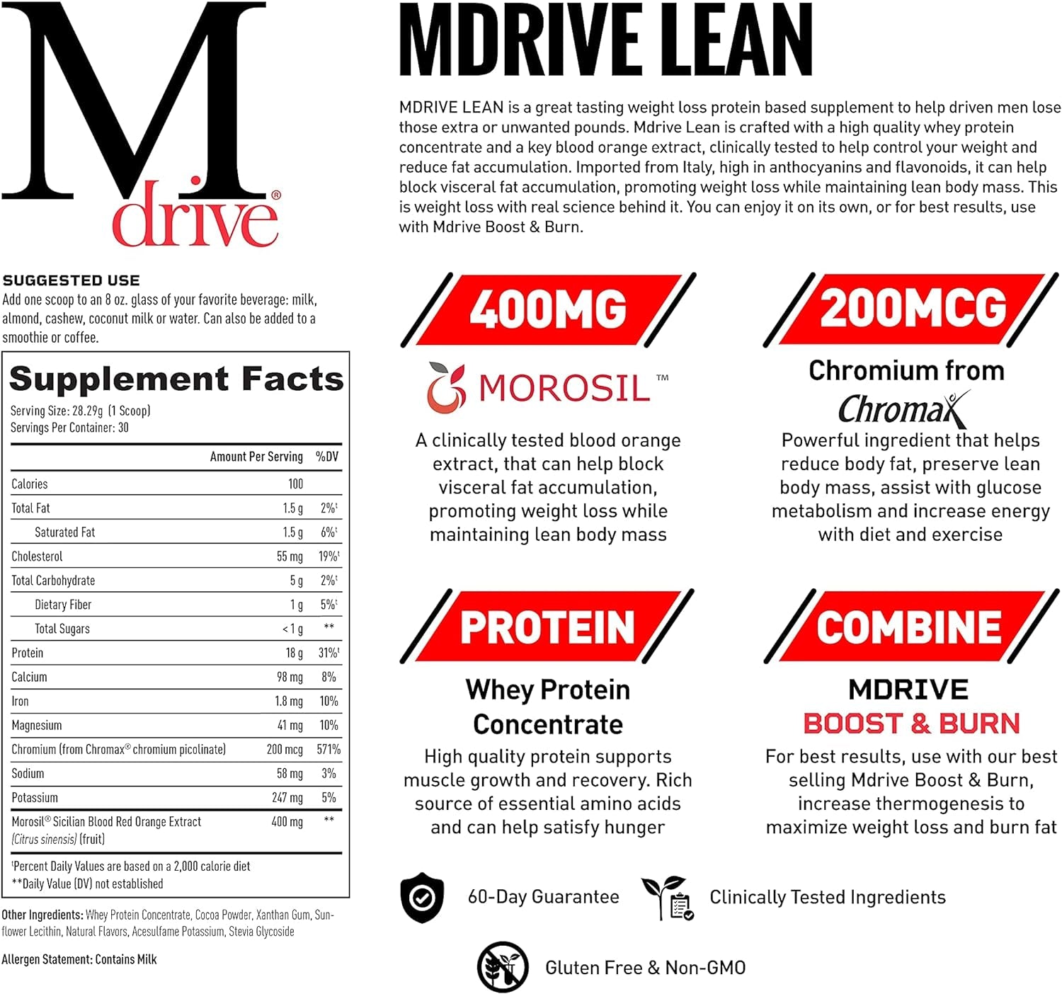 - Mdrive Lean is an everyday protein powder for supporting and preserving lean muscle mass in conjunction with a proper diet and exercise, it can be used on its own, or for best results, use with Mdrive Boost & Burn