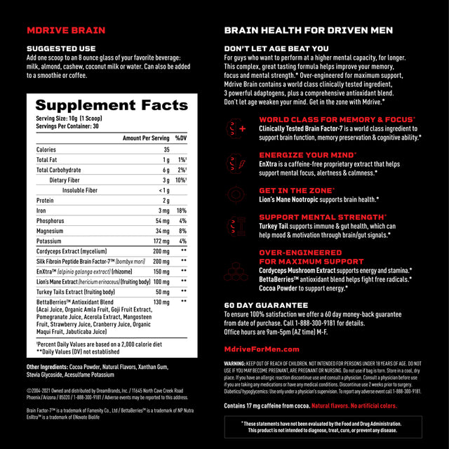 Mdrive Brain for Men, Cognitive Health Shake Powder for Memory Preservation, Alertness and Calmness, Mental Focus, Cognitive Ability, Brain Function, Chocolate Berry Flavor, 30 Servings, 10.6Oz is backordered and will ship as soon as it is back in stock.