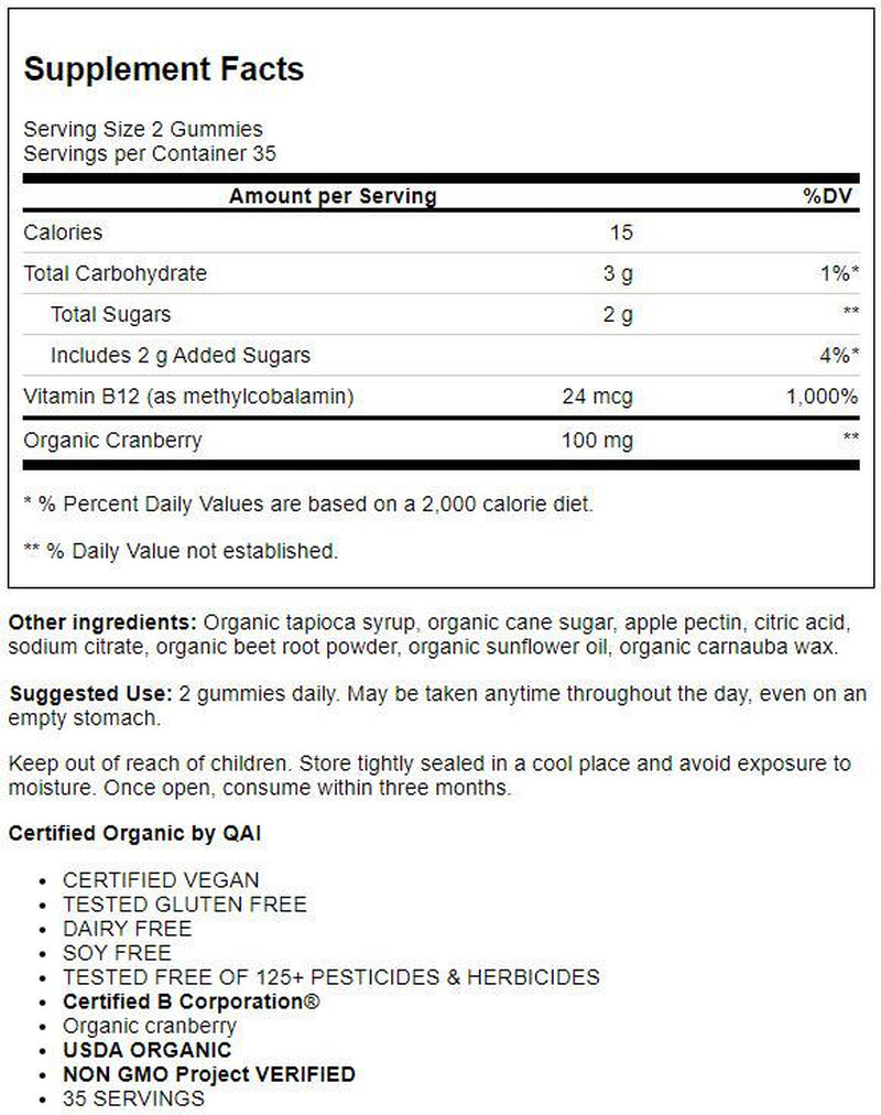 - Organic Cranberries: Give our gummies real berry flavor and color without high-fructose corn syrup, gelatin, or sugary coatings; 2 grams of sugar per serving