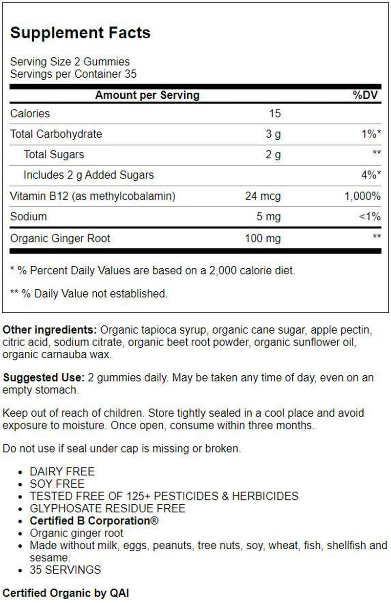Stay on top of your game with MegaFood B12 Energy - Ginger. These delicious gummies featuring vitamin B12 and organic ginger root help support energy levels and production. While B12 is an essential vitamin that plays a key role in red blood cell formation, cell metabolism, nerve function and more, soothing ginger root contains antioxidants and added nutrient benefits but it also gives a tasty twist to these gummies to help spice up your day. Made with only 2 grams of sugar per 2-gummy serving, you can't go wrong with these tasty treats for that added pep to your day.