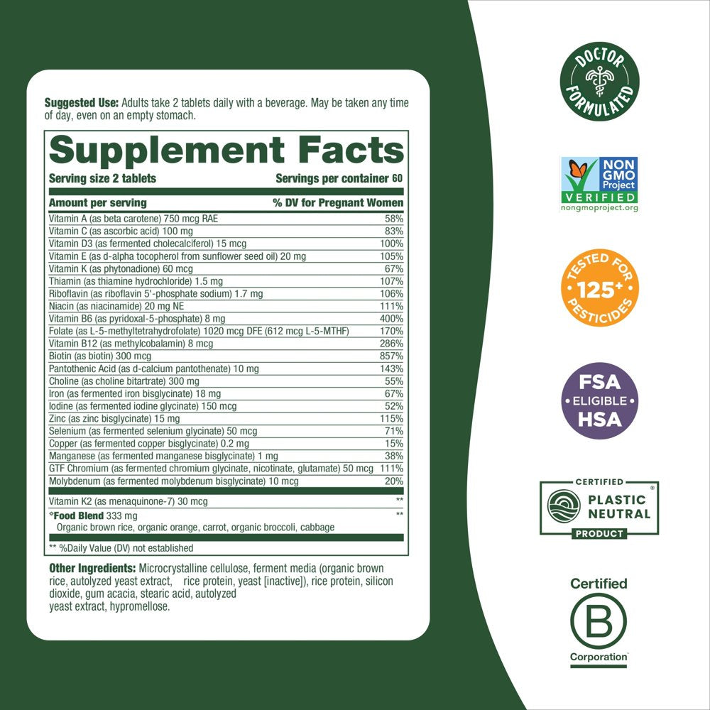 MegaFood's Baby & Me 2 - Prenatal Multi is a doctor-formulated prenatal dietary supplement. It's food based, made with ingredients like brown rice, carrots, broccoli and oranges to give you the essential nutrition that supports the health of mother and the developing child. Each 2-tablet serving delivers an array of vitamins and minerals for a healthy pregnancy.