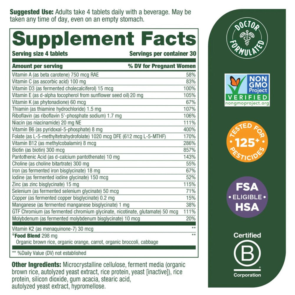 Daily prenatal multivitamin with 23 key nutrients plus real food like broccoli, carrots, & oranges to support optimal nutrition for mom & baby,Doctor-formulated based on leading science - Includes methylated forms of folate and B12, plus 300mg Choline to support baby s brain and spinal cord development,Choline is critical for lifelong memory and cognition, supports baby's brain development and a healthy nervous system, and is necessary for the normal function of all cells,Can take any time a day, even on an empty stomach. 4 mini tablets per serving,Non-GMO, Vegetarian Tested for over 125 chemical substances Made without 9 allergens: milk, eggs, peanuts, tree nuts, soy, wheat, fish, shellfish, and sesame Gluten-Free