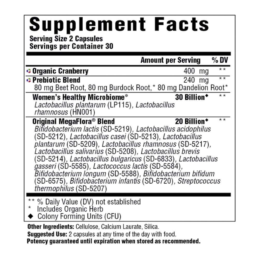 MegaFlora for Women is MegaFood's probiotic tailored for women. Our vegan-friendly formula includes 50 billion microflora from 14 strains, including acid-resistant strains, with superfruit cranberry and probiotics known to promote vaginal and urinary health. Prebiotic foods including burdock and dandelion roots nourish the microbiome and feminine health. We're proudly committed to providing you with supplements that are made without gluten, dairy and soy and are always certified glyphosate residue free.