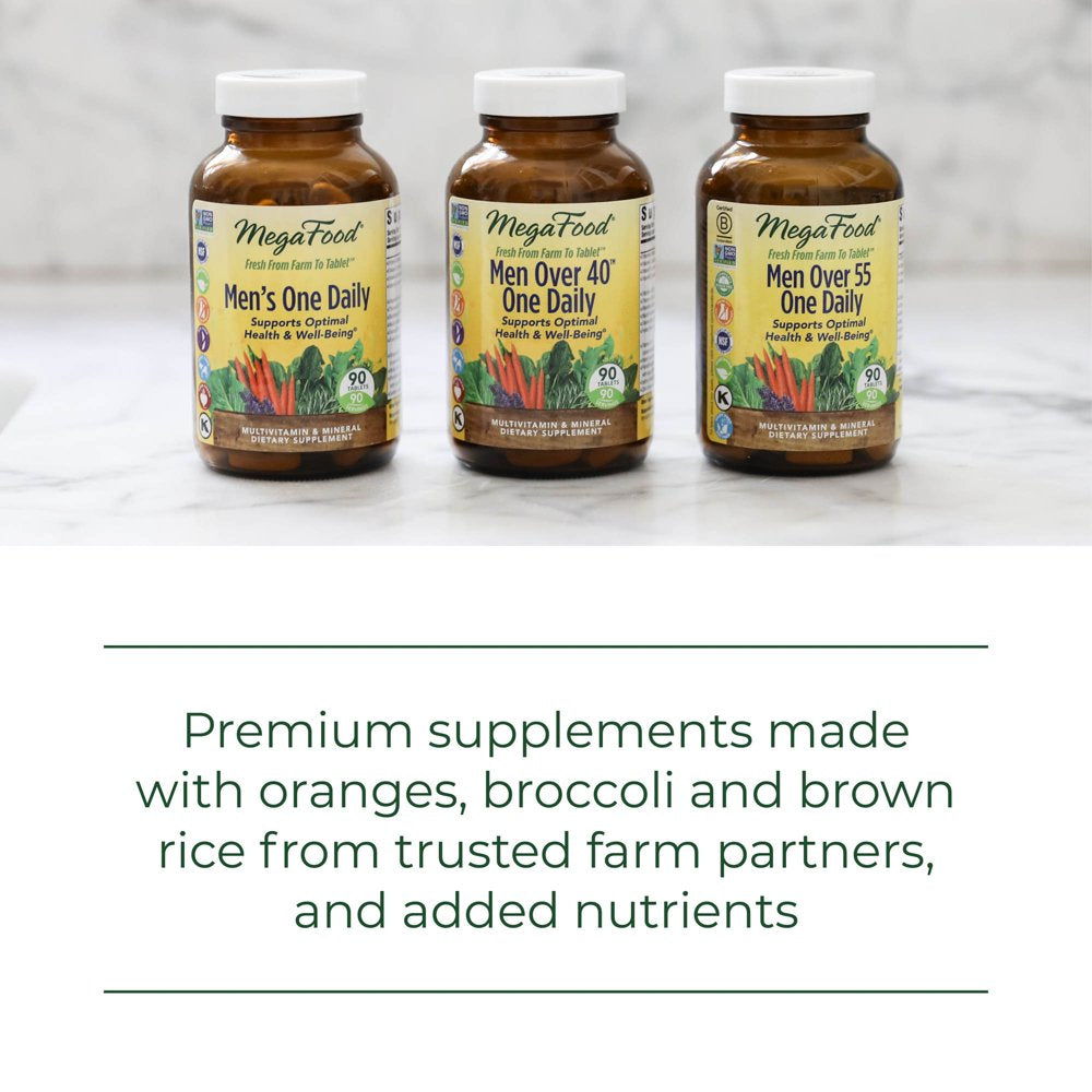 From Farm to Tablet Immune Support Healthy Aging Muscle and Bone Health With 19 Essential Nutrients, No Iron Plus Real Food Dietary Supplement Non GMO Project Verified Tested for 125+ Pesticides Made Without 9 Food Allergens Glyphosate Residue Free Gluten Free Vegetarian Certified B Corporation Kosher MegaFood Men's 55+ One Daily is a foundational multivitamin in a convenient one-a-day tablet, designed to support the nutritional needs of men.