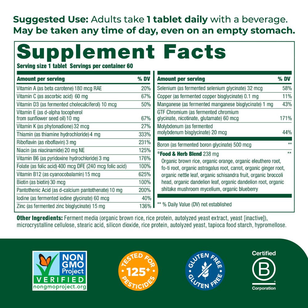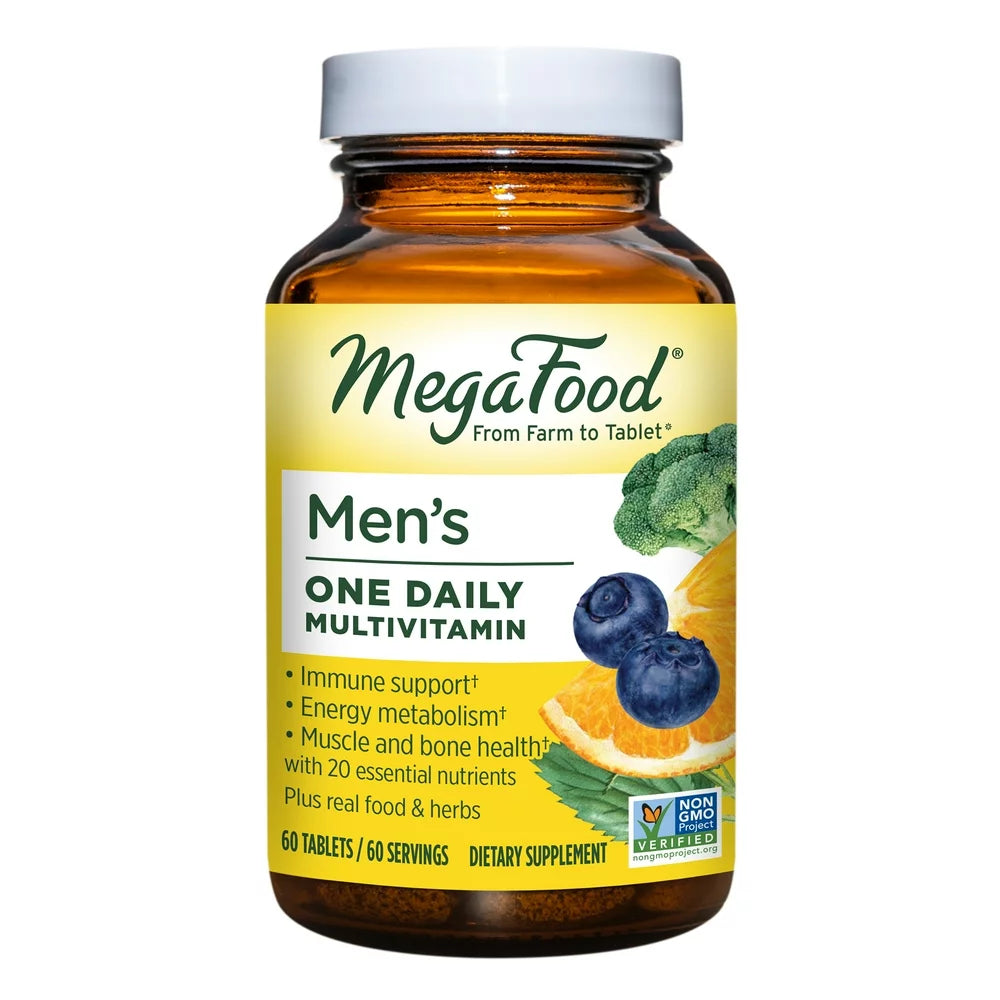 MegaFood offers a Men's One Daily Multivitamin and Mineral Supplement for men of all ages. Let's be honest--it's rare when we have a day that we can confidently say, "I ate my suggested daily intake of vitamins C, E, K and B!" So, be on the safe side with one pill a day of Mother Nature's real foods that your body will recognize as what it is: food! Multivitamin and mineral supplements benefit overall health and wellbeing and are the perfect complement to a healthy lifestyle. With 20 essential nutrients; convenient one-a-day tablet; made with food-paired vitamins and fermented minerals.