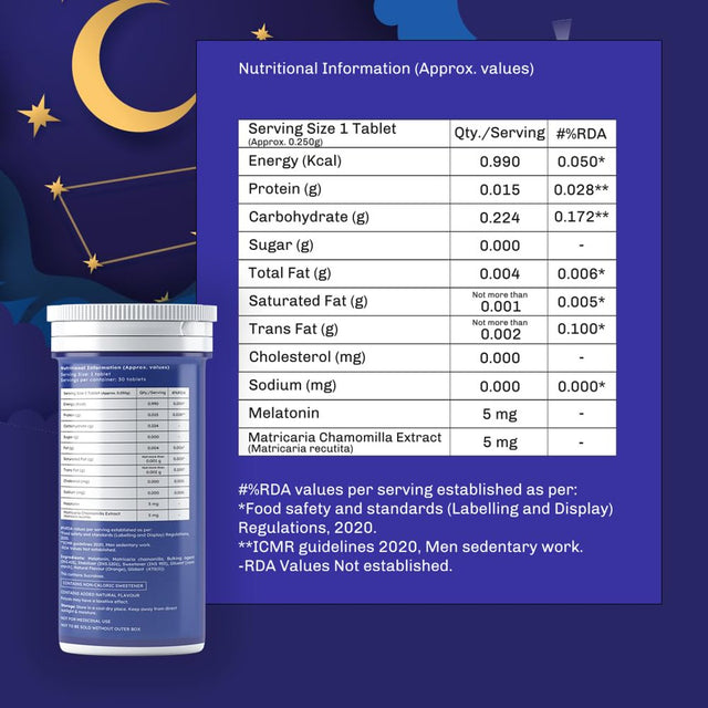 - Ingredients - Melatonin 5 mg supplementation is known to help reset the body's internal clock, making it beneficial for those experiencing difficulties falling asleep.Chamomile Extract (5mg): Derived from the chamomile flower, this extract is renowned for its mild sedative properties and ability to reduce anxiety. Chamomile promotes a sense of calm, making it an ideal complement to melatonin for a restful night's sleep.