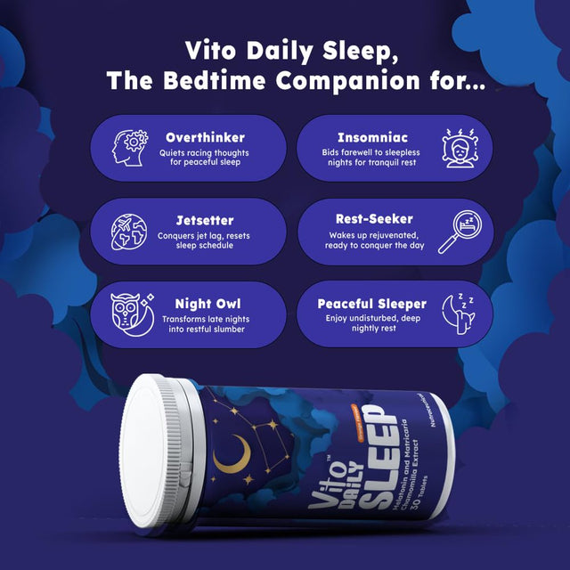 - Relaxed & Restful Sleep: Vito Daily Sleep fast dissolve tablets combine the natural sleep-inducing properties of melatonin and the calming effects of chamomile extract in a convenient and delicious chewable form. These tablets are designed to promote relaxation, and provide a soothing bedtime experience with deep sleep.