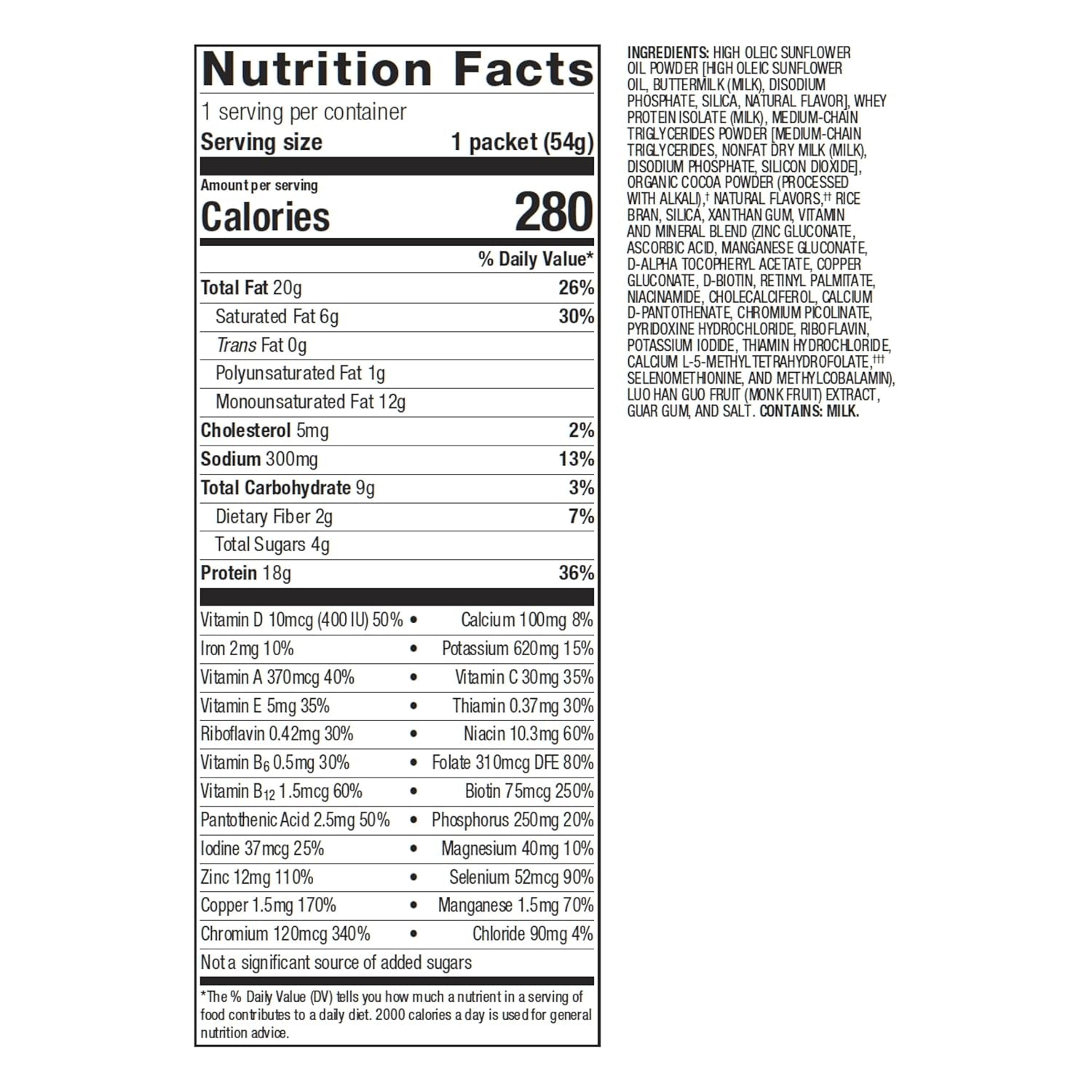 - This nutritional shake mix offers 20 grams of fat, 18 grams of protein, and 9 grams of carbs per serving