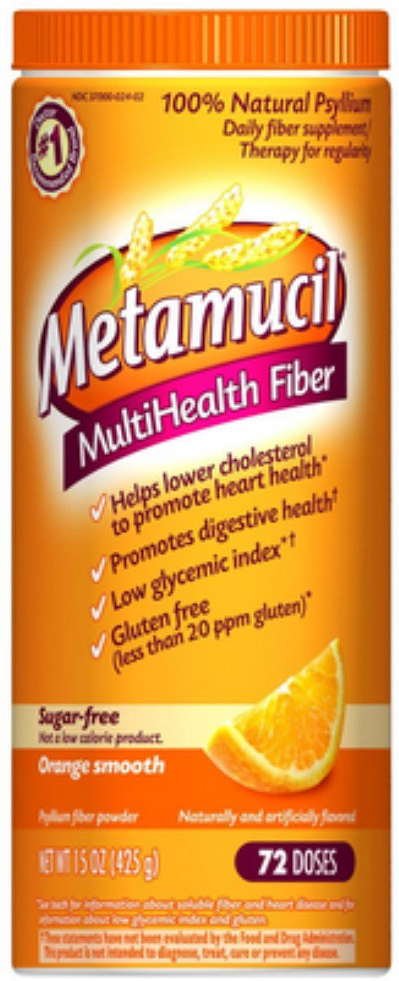 #1 doctor recommended fiber therapy for regularity.Fiber Laxative, SupplementP & G-HealthActive Ingredients:1 Rounded Tsp: Calories 20; Total Carb. 5 g; Dietary Fiber 3 g; Soluble Fiber 2 g; Sugars 0 g; Iron 0.8 mg; Sodium < 5 mg; Potassium < 30 mg; Psyllium Husk Approximately 3.4 gFiber Laxative: Adults 12 yrs. and older: 1 rounded TEASPOON in 8 oz of liquid 3 times daily. Under 12 yrs.; consult a doctor. See mixing directions in Drug Facts. NOTICE: Mix this product with at least 8 oz (a full glass) of liquid. Taking without enough liquid may cause choking. Do not take if you have difficulty swallowing. Put one dose into an empty glass. Mix this product (child or adult dose) with at least 8 ounces (a full glass) of water or other fluid. Taking this product with out enough liquid may cause choking. See choking warning. Stir briskly and drink promptly. If mixture thickens, add more liquid and stir. Adults 12 yrs. and older - 1 rounded TEASPOON in 8 oz of liquid at the first sign of irregularity. Can be taken up to 3 times daily. Generally produces effect in 12 - 72 hours. 6-11 yrs. - 1/2 adult dose in 8 oz of liquid, up to 3 times daily. Under 6 yrs. - Consult a doctor. Laxatives, including bulk fibers, may affect how well other medicines work. If you are taking a prescription medicine by mouth, take this product at least 2 hours before or 2 hours after the prescribed medicine. As your body adjusts to increased fiber intake, you may experience changes in bowel habits or minor bloating. New Users: Start with 1 dose per day; gradually increase to 3 doses per day as necessary. Store at room temperature tightly closed to protect from humidity.Inactive Ingredients:Aspartame; Citric Acid; FD&C Yellow No. 6; Maltodextrin; Natural and Artificial Orange Flavor; Each Tablespoon Contains: Potassium 30 mg; Sodium 5 mgUses:Fiber Laxative: For Cholesterol Lowering and Heart Health. Diets low in saturated fat and cholesterol that include 7 grams of soluble fiber per day from psyllium husk, as in Metamucil, may reduce the risk of heart disease by lowering cholesterol. One adult dose of Metamucil has 2.4 grams of this soluble fiber. Consult a doctor if you are considering use of this product as part of a cholesterol-lowering program. Effective in treating occasional constipation and restoring regularity. Make A Change Today For Heart Health. Helps Lower Cholesterol!. #1 Doctor Recommended. Did you know that diets including Metamucil have been clinically proven to lower cholesterol? In fact, a heart-health claim about psyllium fiber (as in Metamucil) and cholesterol reduction has been approved by the US FDA. So enjoy great tasting Orange Metamucil and start something that tastes great and can help your heart. Not a low calorie product.Laxative: Choking: Taking this product without adequate fluid may cause it to swell and block your throat or esophagus and may cause choking. Do not take this product if you have difficulty in swallowing. If you experience chest pain, vomiting, or difficulty in swallowing or breathing after taking this product, seek immediate medical attention. Allergy alert: This product may cause allergic reaction in people sensitive to inhaled or ingested psyllium. Ask a doctor before use if you have: a sudden change in bowel habits persisting for 2 weeks. abdominal pain, nausea or vomiting. Stop use and ask a doctor if: constipation lasts more than 7 days; rectal bleeding occurs. These may be signs of a serious condition. Keep out of reach of children. In case of overdose, get medical help or contact a Poison Control Center right away. PHENYLKETONURICS: CONTAINS PHENYLALANINE, 25 mg per teaspoon.