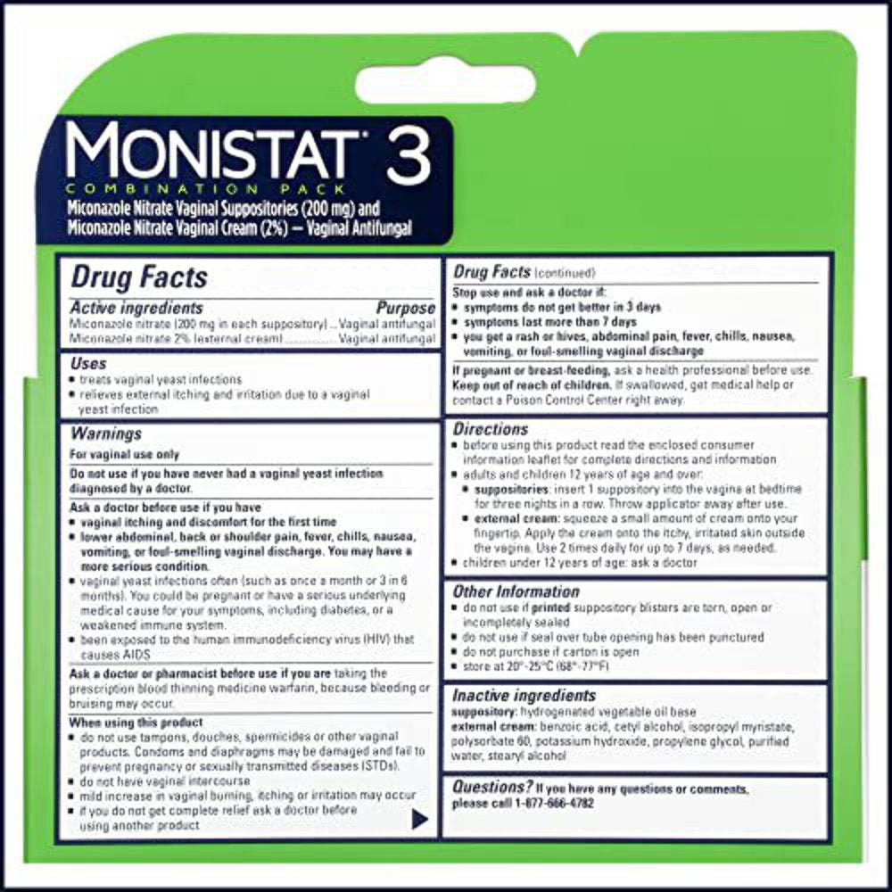 - Monistat vaginal suppositories combination pack relieves yeast infection symptoms 4x faster than the leading prescription pill*; pack includes external Monistat anti-itch cream